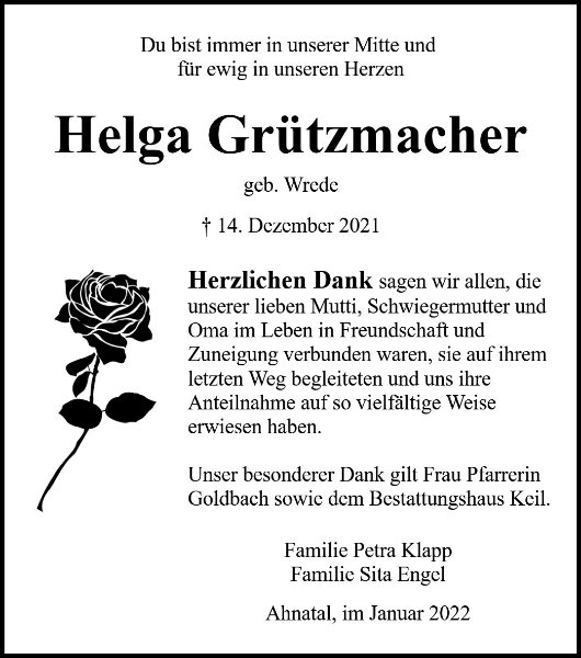 Verlust der langjährigen Familienmutter, und Großmutter, dass sich mit ihrem Fortgang ein ganz, ganz tiefer Einschnitt vollzieht, der nicht leicht zu verkraften ist; trotzdem wurde Helga ein gesegnetes Alter gewährt am Ende eines langen, bisweilen vermutlich beschwerlichen Weges. Wir erinnern uns Ihrer stets freundlichen und aufgeschlossenen, liebevollen und unbeschwert-verbindlichen Art sehr gerne und fühlen uns nach wie vor aufs Engste mit ihr verbunden. Gern denken wir an die gemeinsamen Zeiten der Bundeswehrjahre im Kasseler Panzergrenadierbataillon 42 und an kameradschaftliche Treffen in Fritzlar, Bad Sooden-Allendorf, Helsa und Heckershausen zurück. Wir hoffen in stillem Gedenken, dass sich Eure tiefe Trauer über das, was Ihr verloren habt, allmählich in Dankbarkeit verwandelt für das, was Euch geschenkt war. Bewahrt Euch in Eurem Herzen ein liebevolles Andenken an Eure Mutter, Schwiegermutter und Großmutter, so wie sie in ihren besten Jahren war, dann bleibt sie – wenn auch in anderer Gestalt - für immer bei Euch – das wissen wir aus eigener Erfahrung.