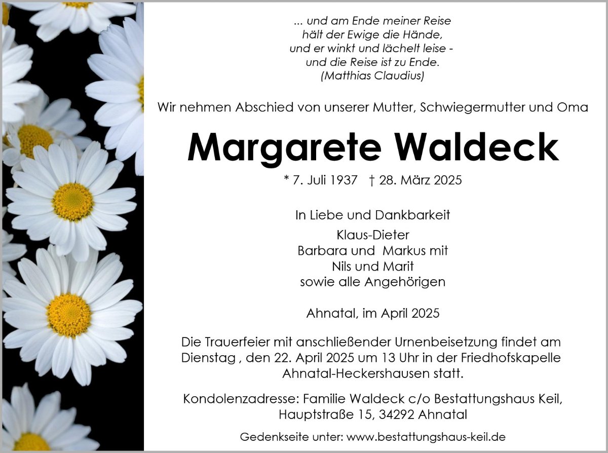 Trauerfeier mit anschließender Urnenbeisetzung, Ahnatal-Heckershausen